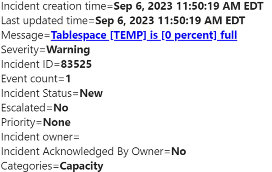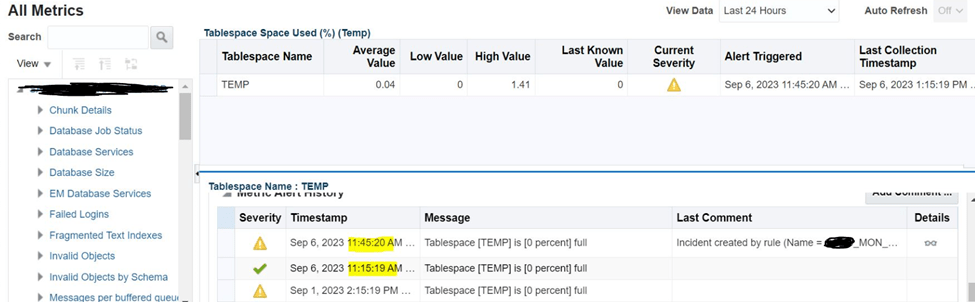 Also, a 30-minute delay between the creation of alerts and incidents was noted. This delay is normal and depends on the metric collection schedule. In this case, the Temp tablespace metric collected data every 30 minutes.